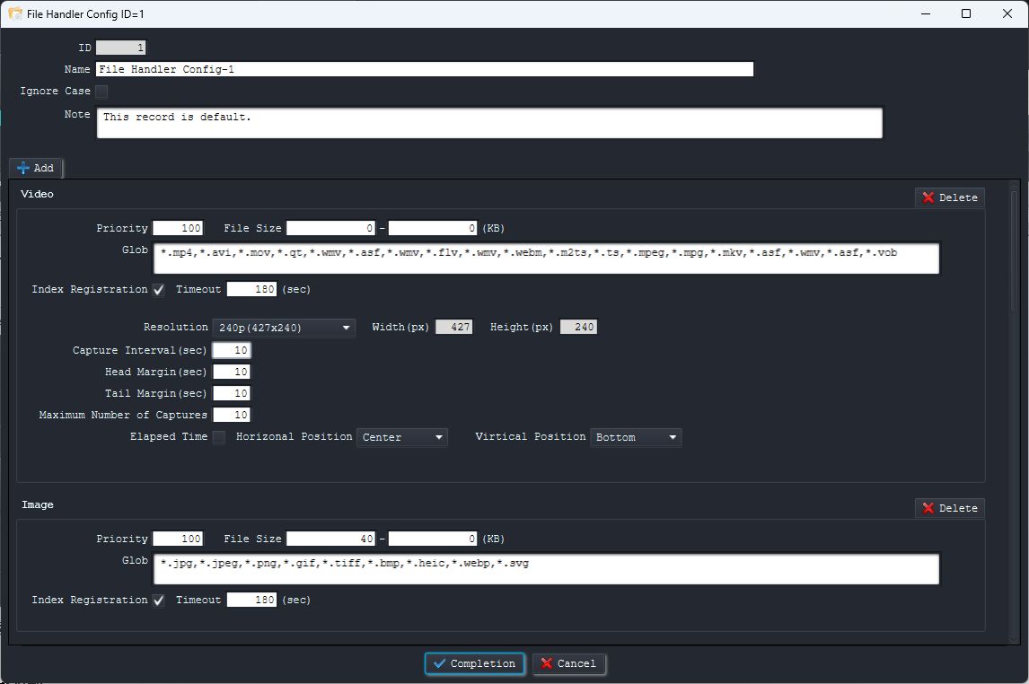 【Video ハンドラーの設定項目】① Resolution (Default=144p)キャプチャー(サムネイル作成)の解像度。「指定」を選択した場合は事項の幅、高さの設定値が採用されます。② Interval (Sec.)キャプチャー(サムネイル作成)の間隔③ Head Margin (Sec.)初回のキャプチャー(サムネイル作成)までの再生時間④ Tail Margin (Sec.)キャプチャー(サムネイル作成)対象外とする動画末尾の再生時間(デフォルトは10秒)⑤ Maximum number of captures最大キャプチャ数⑥ Elapsed Timeチェックした場合は、キャプチャタイミングを画像に埋め込むみます。「Completion」ボタンを押下して保存となります。