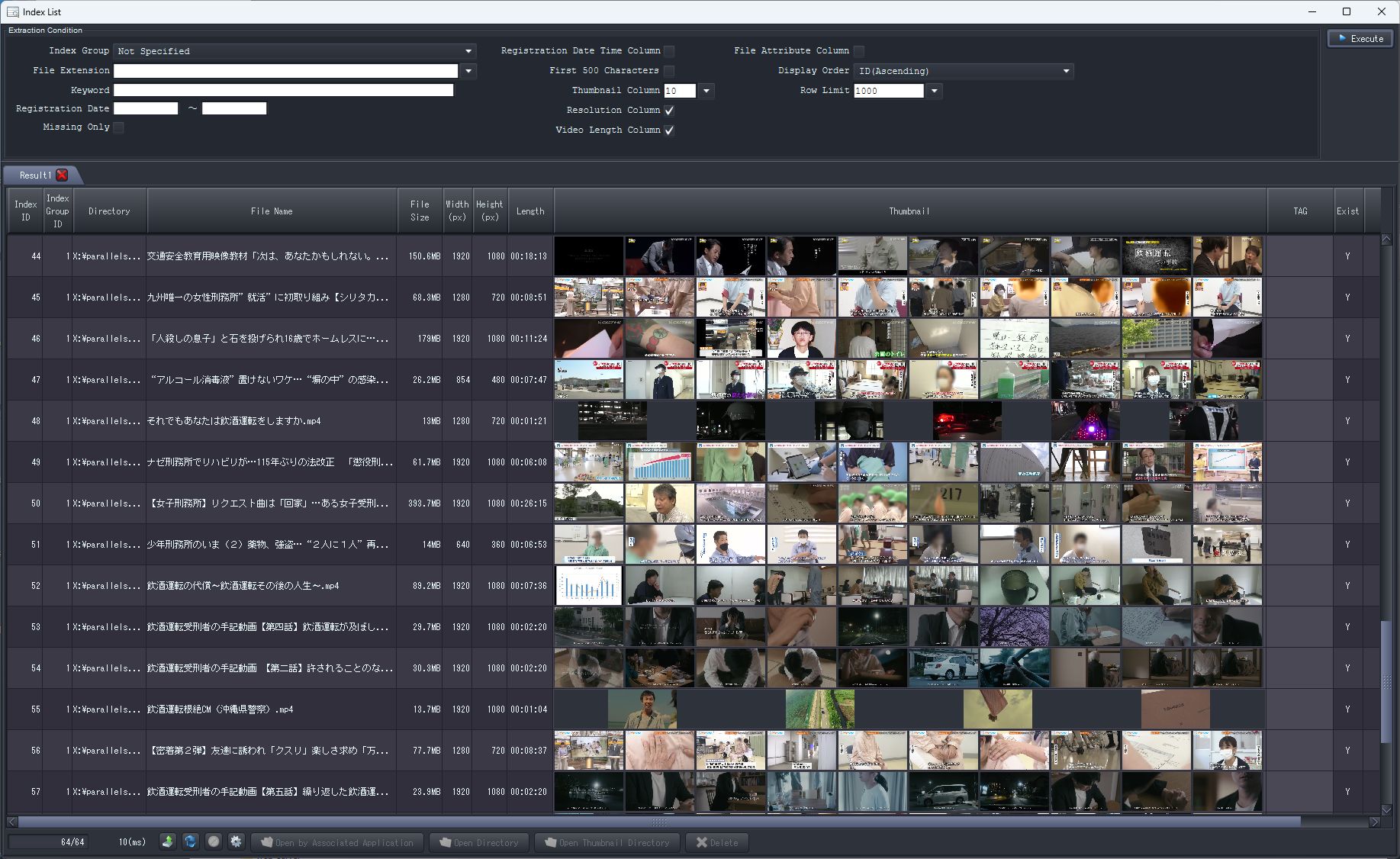 項目名 設定内容 備考 Priority 優先順位を昇順で設定。ゼロ以下は無効となります。 デフォルト=100 File Size ファイルサイズの範囲をKBで設定。ゼロ以下は制限対象となりません。 Glob 対象のファイルをGLob形式で設定します。 Index Registration インデックス登録する場合はチェックします。 Timeout インデックス登録後の2次処理(サムネイル作成など)のタイムアウト(秒)を設定します。ゼロ以下はタイムアウト無効となります。 デフォルト=180