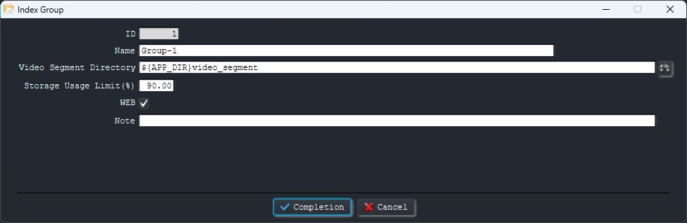 項目名 設定内容 備考 Name 名称を設定します。 必須 Video Segment Directory WEBサーバにおける、動画ファイルのHLS用セグメントファイルの出力先。 Storage Usage Limit HLS用セグメントファイルの出力先ストレージの使用率上限。上限に達した場合はHLS用セグメントファイルを作成しません。 WEB WEBサーバにおける、抽出対象とする場合はチェックします。 Note 備考